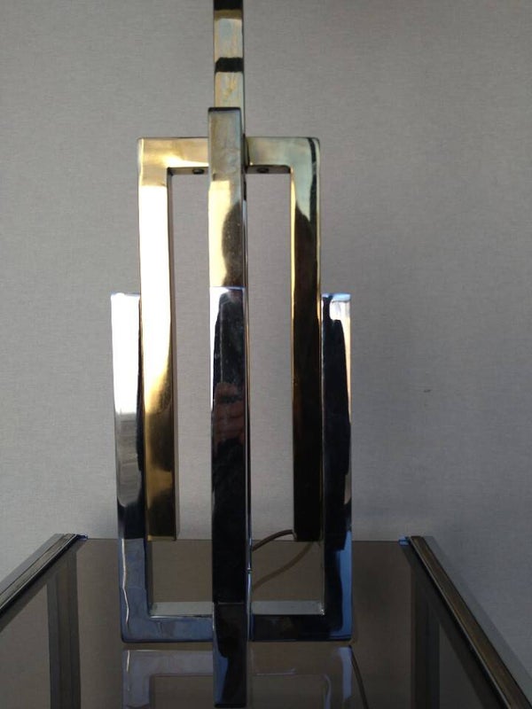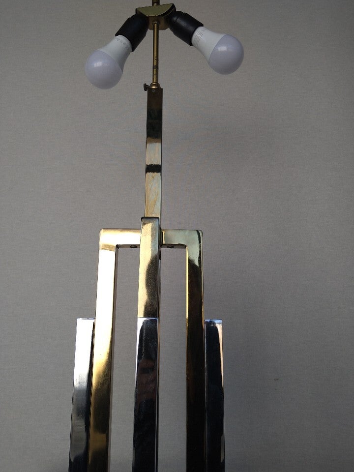 Beautiful 1970s Regency design brass/chrome lamps by Willy Rizzo for Lumica. The diameter of the lampshade is 60 cm. The side tables (2 pieces) are available as an option for an additional charge of €250 for both.