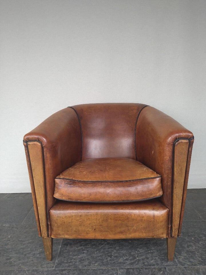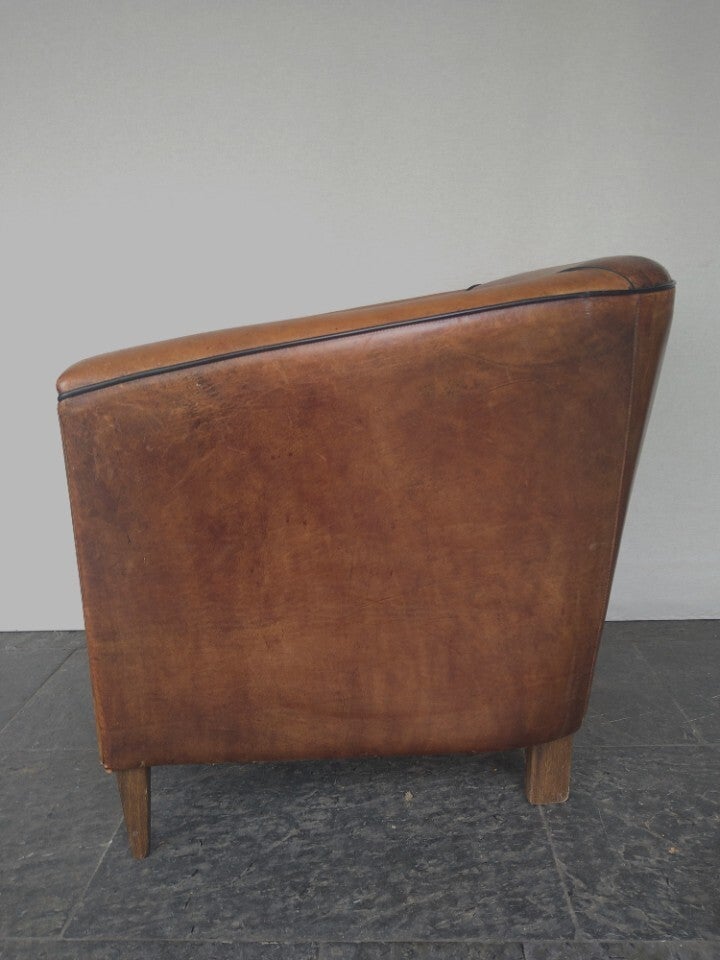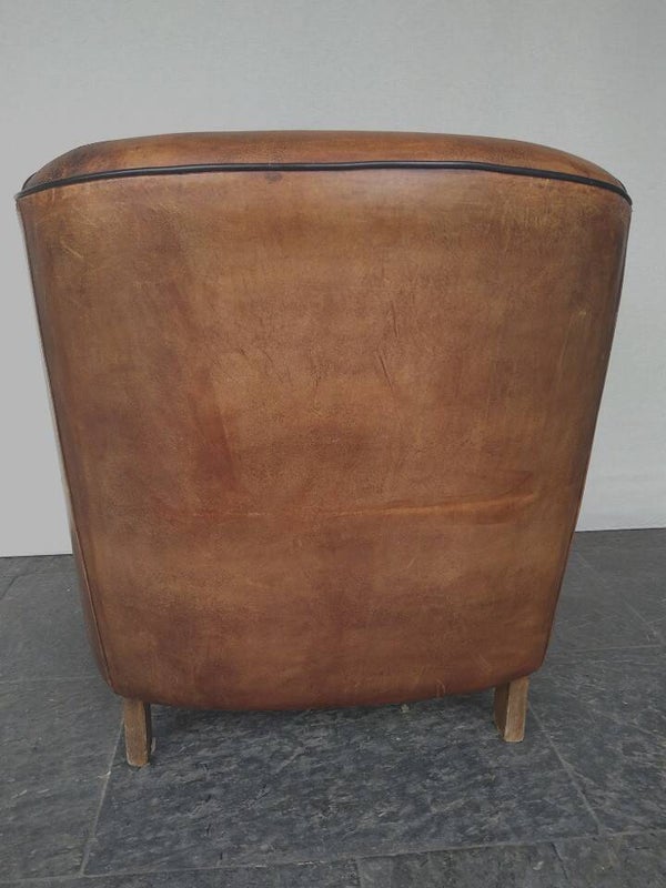 Karaktervolle geleefde schaapsleren club fauteuil. In goede staat, de zitting heeft gebruikssporen. Mooie patina. zithoogte : 47 cm rughoogte : 76 cm zitdiepte : 55 cm breedte : 75 cm