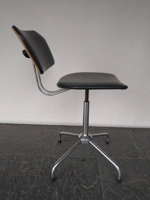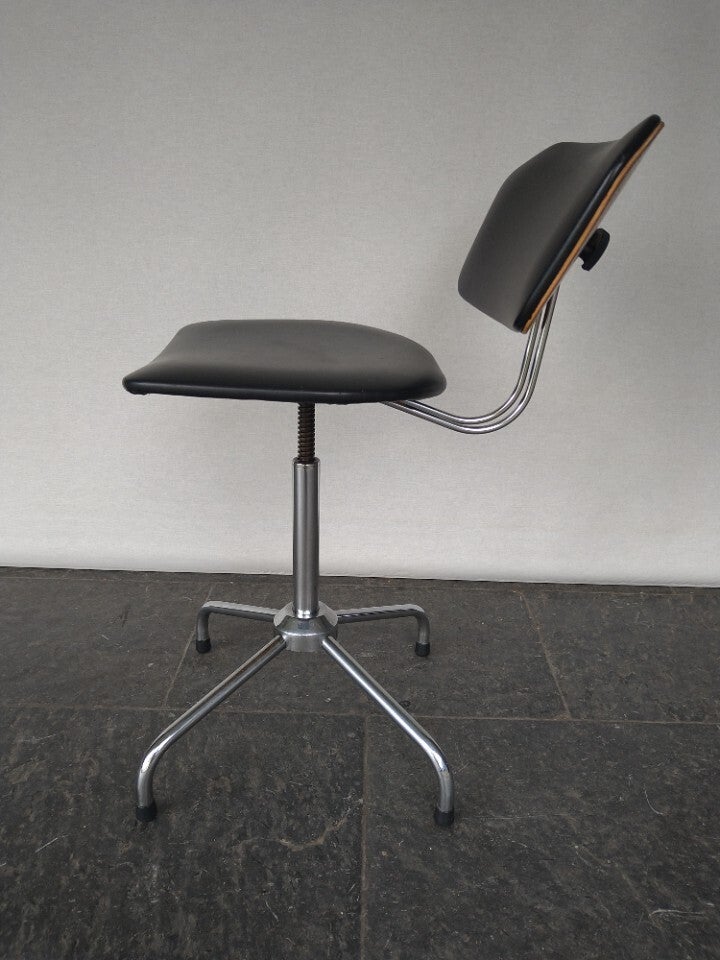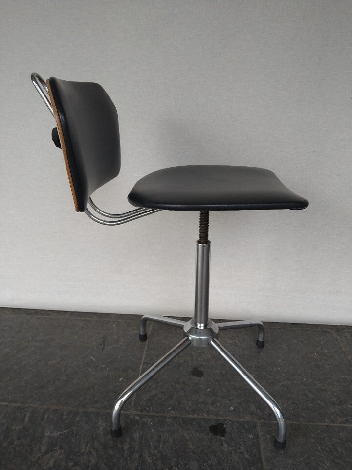 vintage goede en mooie bureaustoel met zwart kunstleer en houten rugleuning. in hoogte verstelbaar door middel van draaipin en draaiknop op rugleuning. De draaiknop is beschadigd. zithoogte: 44-58 cm.